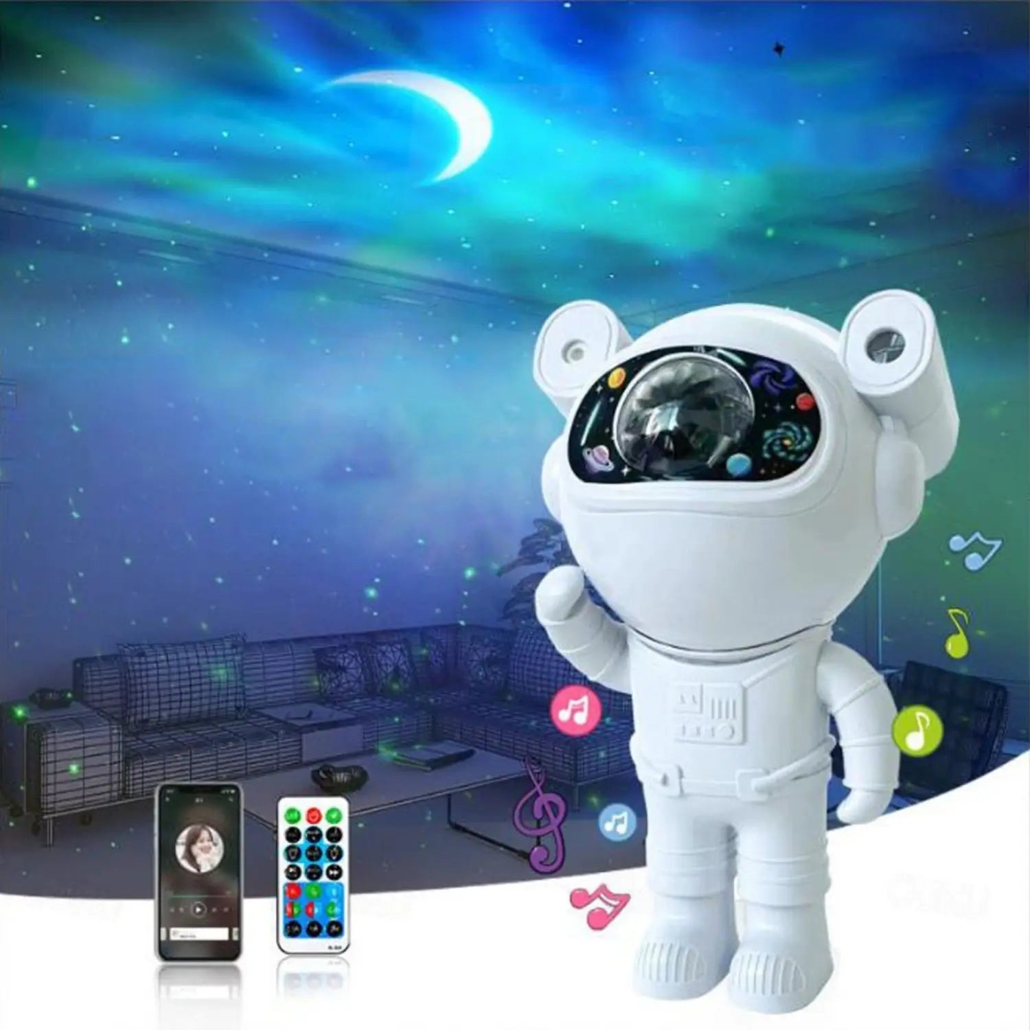 Plongez dans une ambiance magique avec une projection de lune et d'aurores boréales au plafond. Grâce à la télécommande et à la connexion Bluetooth, réglez la luminosité et créez une ambiance apaisante avec des berceuses et des sons relaxants.
